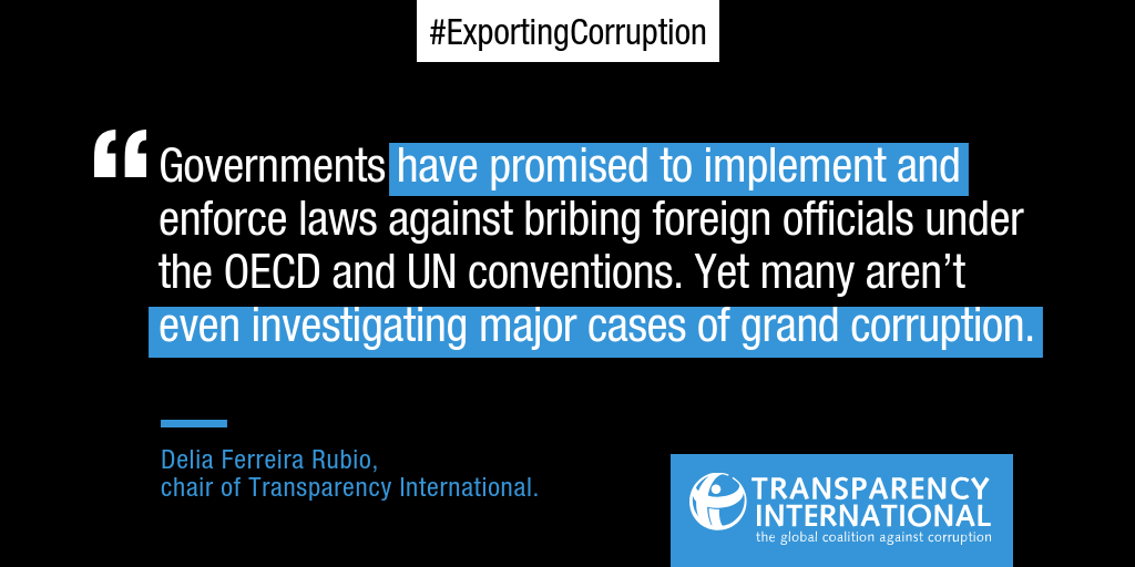 «Είναι απαράδεκτο ότι τόσο μεγάλο ποσοστό του παγκόσμιου εμπορίου έχει καταστεί ευάλωτο στη διαφθορά άνευ επιπτώσεων», ανέφερε η Delia Ferreira Rubio, Πρόεδρος της Διεθνούς Διαφάνειας. «Οι Κυβερνήσεις έχουν υποσχεθεί να εφαρμόσουν και να επιβάλλουν νόμους ενάντια στην δωροδοκία αλλοδαπών αξιωματούχων, στο πλαίσιο των Συνθηκών του ΟΟΣΑ και των Ηνωμένων Εθνών. Ωστόσο, αρκετές δεν προβαίνουν καν στη διερεύνηση σημαντικών υποθέσεων μείζονος διαφθοράς, στις οποίες εμπλέκονται δημόσιες επιχειρήσεις και υψηλόβαθμοι πολιτικοί. Αυτές οι υποθέσεις έχουν ένα ιδιαίτερα διαβρωτικό αποτέλεσμα και το χειρότερο είναι ότι οπωσδήποτε επηρεάζουν τους μέσους πολίτες των χωρών τους.»
