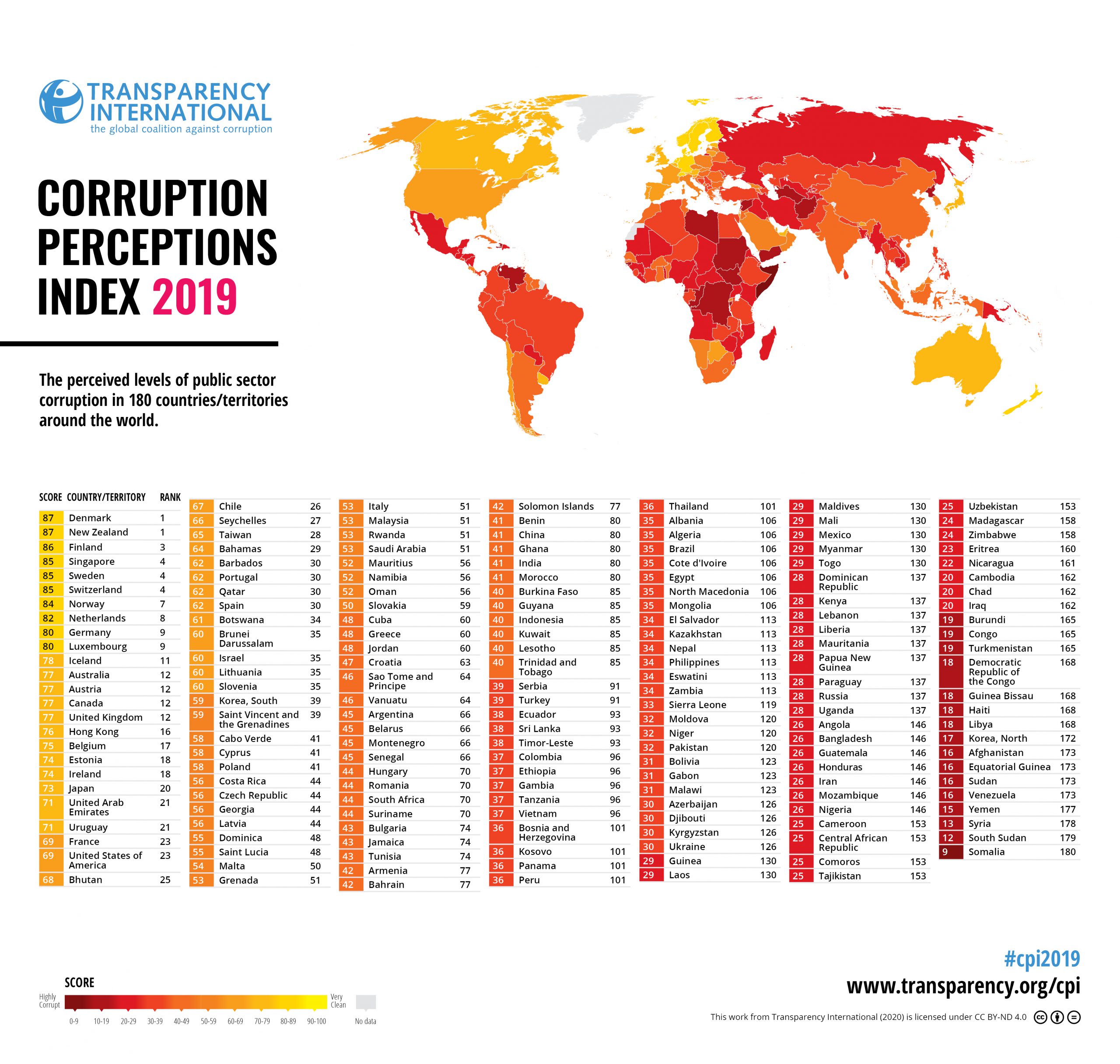 Ο Δείκτης Αντίληψης Διαφθοράς κατατάσσει 180 χώρες και περιφέρειες με βάση τα επίπεδα αντίληψης της διαφθοράς στον δημόσιο τομέα, χρησιμοποιώντας 13 αξιολογήσεις εμπειρογνωμόνων και έρευνες ειδικών. Χρησιμοποιεί την κλίμακα από το μηδέν (0) [υψηλή διαφθορά] ως το εκατό (100) [σχεδόν καθόλου διαφθορά].