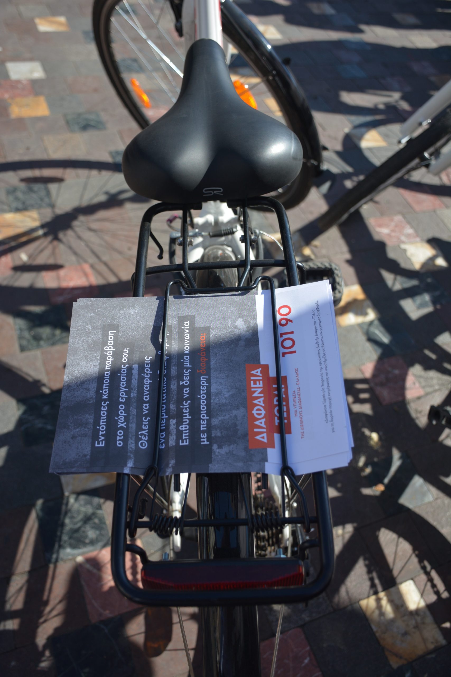 Σε μία διαφορετική δράση με ποδήλατα είχαν την ευκαιρία να συμμετάσχουν όσοι είχαν τη διάθεση να βολτάρουν στην πόλη και να γίνουν για λίγο «πρεσβευτές της διαφάνειας». Εμείς βάλαμε τα ποδήλατα κι εκείνοι έβαλαν την εθελοντική δράση. Στη βόλτα μας με τίτλο: “Cycle for transparency. Don’t recycle corruption” o Γιώργος Αμυράς με την ομάδα του, ανέλαβαν να οδηγήσουν τους ποδηλάτες σε 6 πλατείες της Αθήνας και να μεταδώσουν το μήνυμα για περισσότερη διαφάνεια στη ζωή μας.