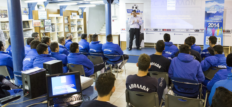 Το πρόγραμμα έχει ήδη ξεκινήσει με εκπαιδευτικές παρουσιάσεις και συναντήσεις στις Ποδοσφαιρικές Ακαδημίες του Απόλλωνα Σμύρνης και του Αστέρα Τρίπολης. Οι δράσεις θα συνεχιστούν το 2014 με τις Ποδοσφαιρικές Ακαδημίες των υπολοίπων 16 ομάδων που συμμετέχουν στη Super League, καθώς και με τη διεξαγωγή δημόσιας εκδήλωσης για τα συμπεράσματα του προγράμματος στα πλαίσια του Διεθνούς Συνεδρίου “FootbAllAbout”, το οποίο θα πραγματοποιηθεί στα τέλη Μαρτίου του 2014.