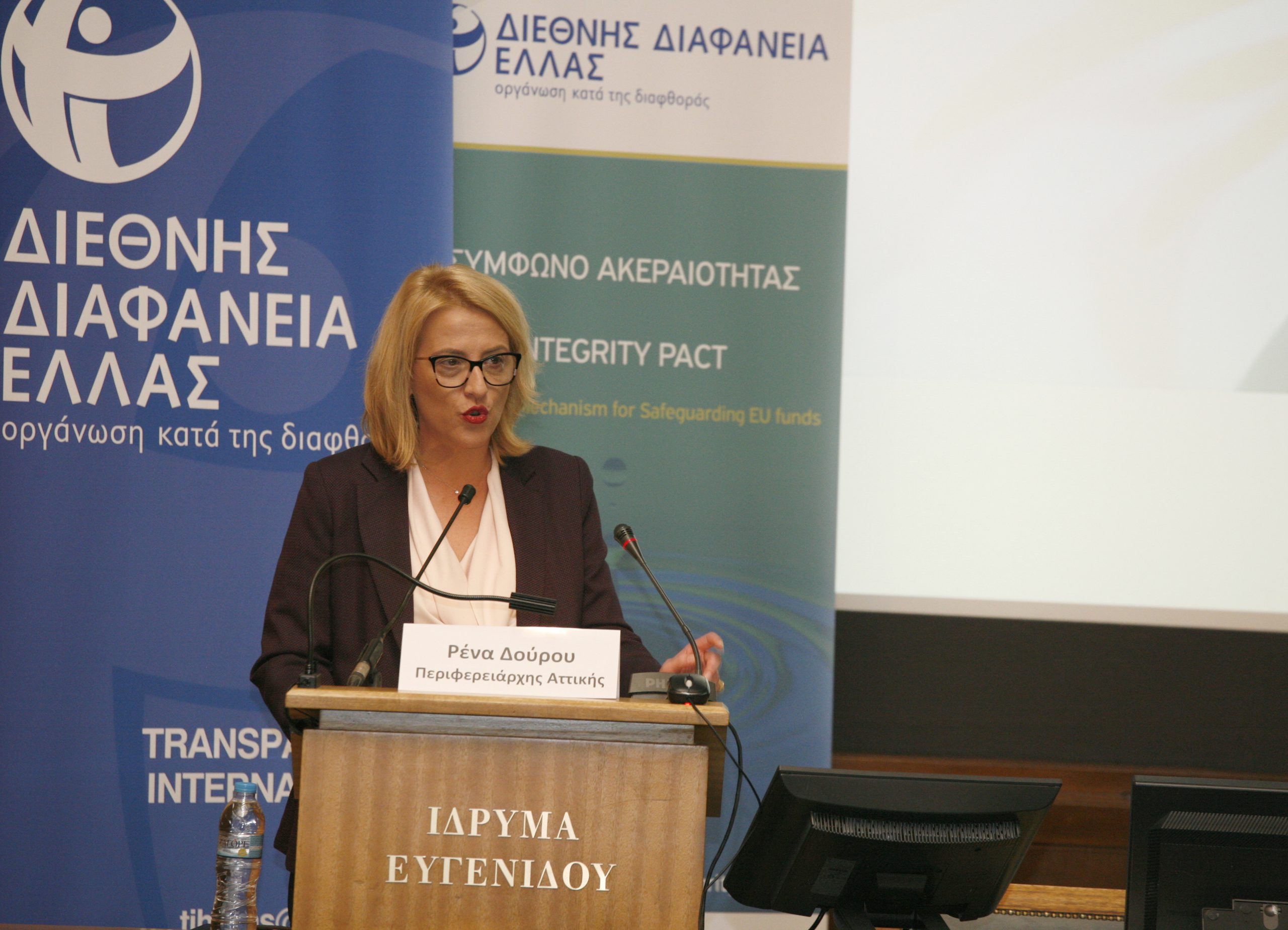 Από την πλευρά της, η Περιφερειάρχης Αττικής, κα Ρένα Δούρου, έκανε λόγο για «διμέτωπο αγώνα» στην προσπάθεια καταπολέμησης της διαφθοράς στις δημόσιες συμβάσεις: την ανάγκη για βελτίωση της καθημερινότητας και την πάλη για την αλλαγή στην άσκηση της εξουσίας, φέρνοντας ως παράδειγμα την χρήση του «Συμφώνου Ακεραιότητας» σε ένα πολύ σημαντικό αντιπλημμυρικό έργο σε περιοχές των Δήμων Μοσχάτου-Ταύρου και Νίκαιας-Αγ. Ι. Ρέντη.