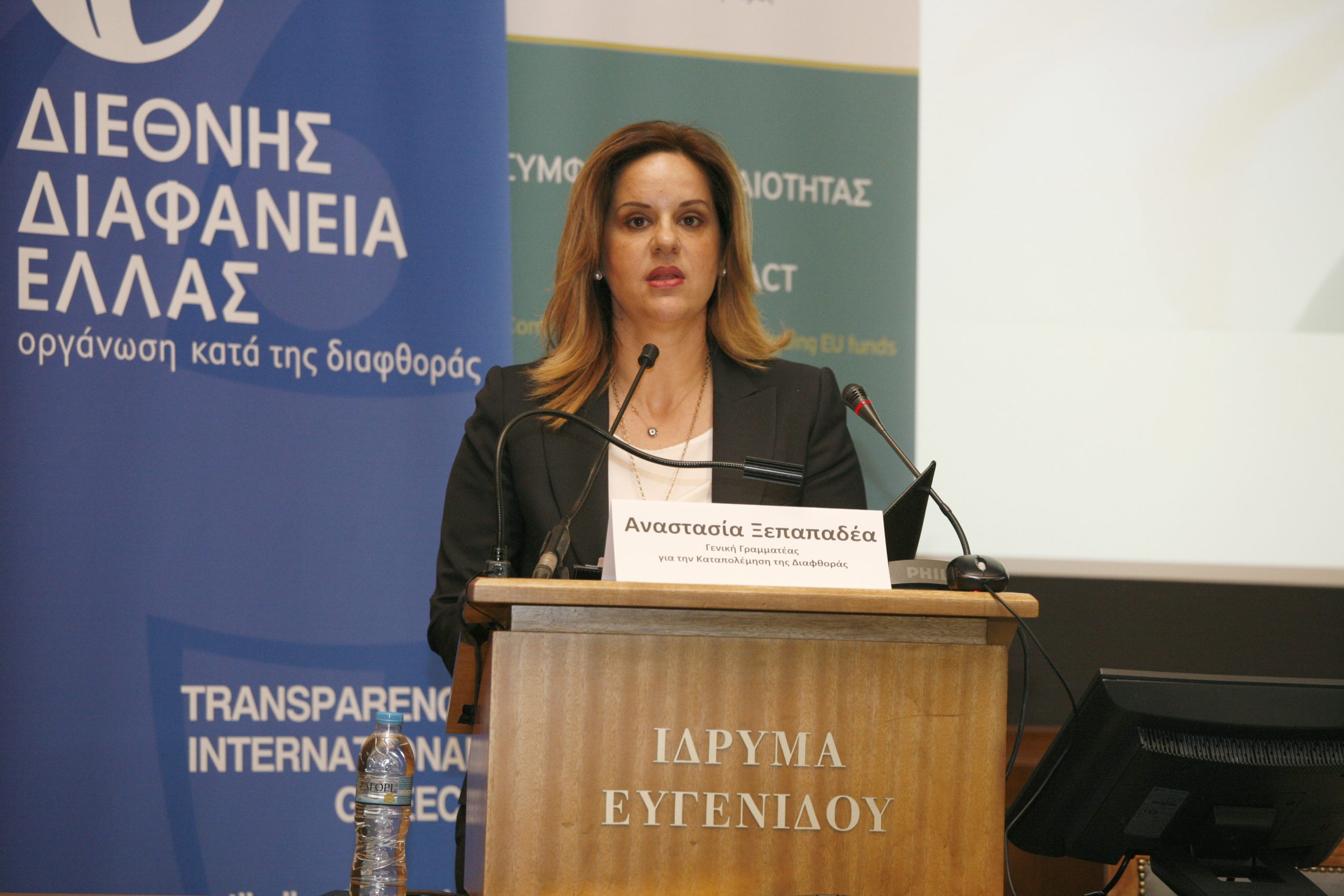 Στην συνέχεια, εκπροσωπώντας την Κυβέρνηση, το λόγο πήρε η Γενική Γραμματέας για την Καταπολέμηση της Διαφθοράς, κα Αναστασία Ξεπαπαδέα, η οποία αναφέρθηκε στο γεγονός ότι ο κίνδυνος της διαφθοράς στις δημόσιες συμβάσεις επιτείνεται όλο και περισσότερο, λόγω της πολυπλοκότητας των διαδικασιών και της εμπλοκής σε αυτές πολλών φορέων, ενώ τόνισε ότι η απώλεια σε έσοδα είναι τεράστια τόσο για τα κράτη όσο και για την Ευρωπαϊκή Ένωση.