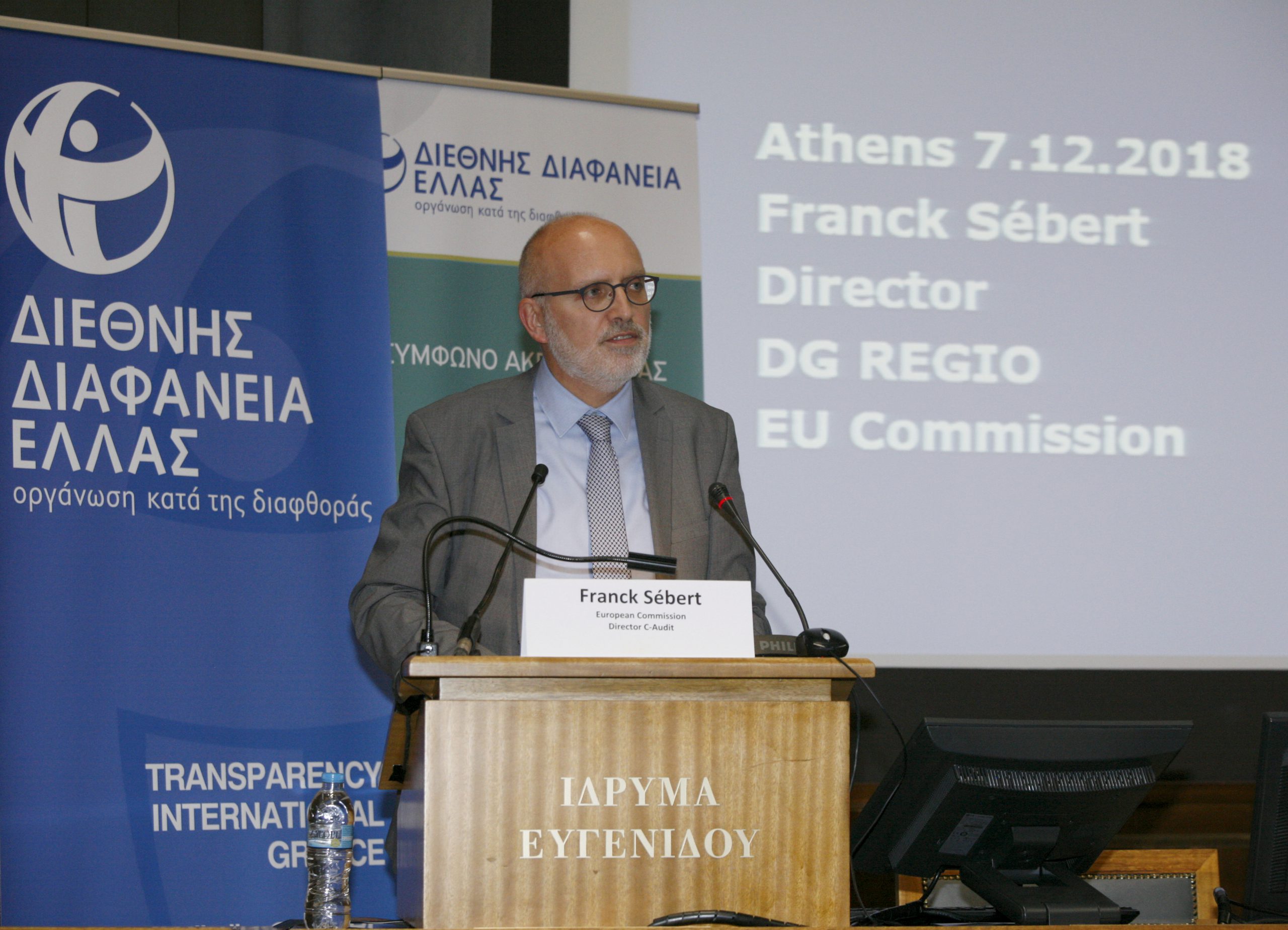 Στην κεντρική ομιλία του συνεδρίου, ο κ. Franck Sébert, Διευθυντής Εσωτερικού Ελέγχου της Γενικής Διεύθυνσης Περιφερειακής και Αστικής Πολιτικής της Ευρωπαϊκής Επιτροπής ανέφερε ότι η καταπολέμηση της διαφθοράς αποτελεί απόλυτη προτεραιότητα της Ευρωπαϊκής Ένωσης, προσθέτοντας ότι τα τελευταία χρόνια υλοποιείται έργο ύψους 920 εκατ. ευρώ για τον έλεγχο των δημόσιων συμβάσεων, στο οποίο συμμετέχουν 11 χώρες της Ευρωπαϊκής Ένωσης.